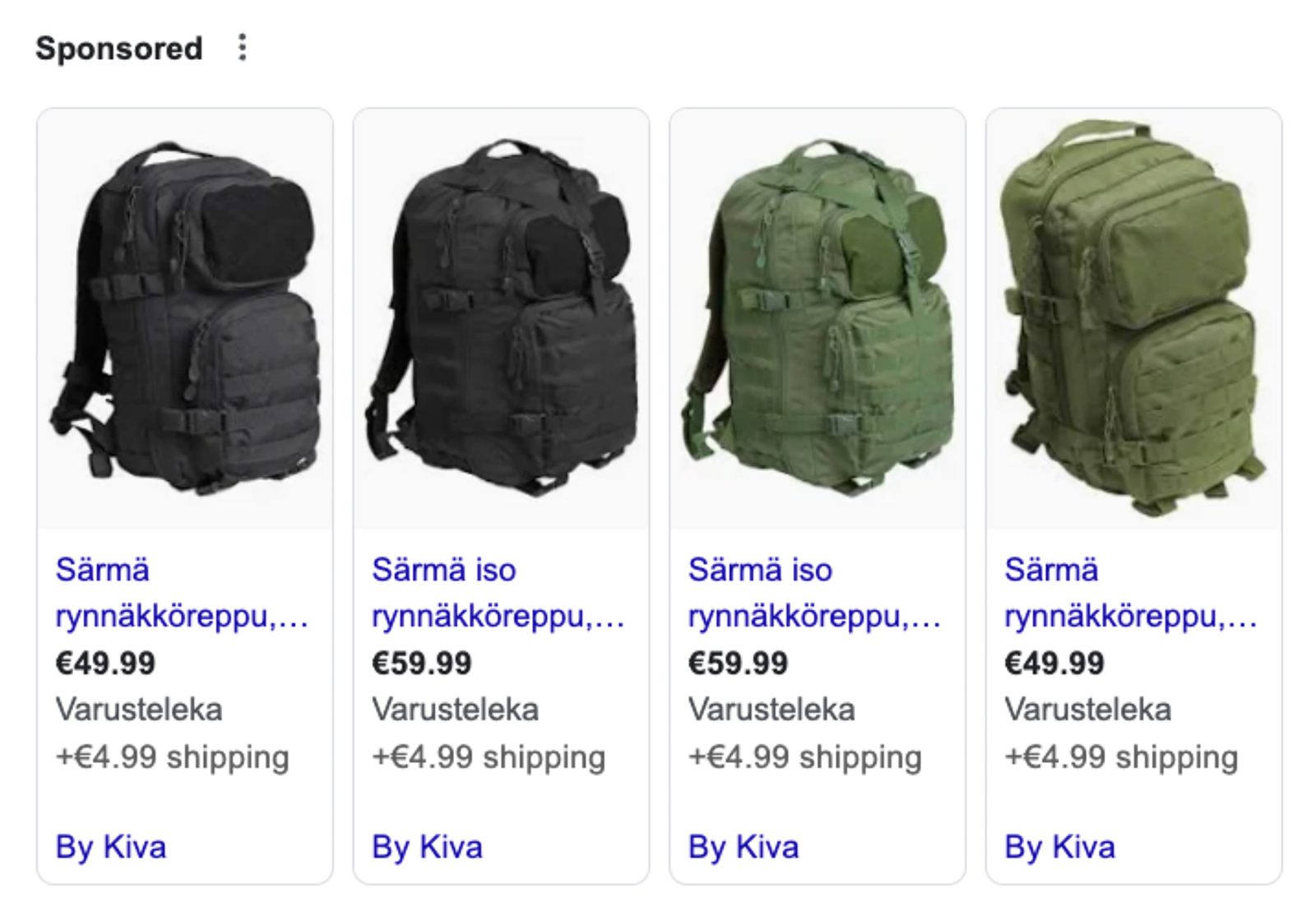 Google Shopping -mainokset näkyvät Googlen hakutuloksissa verkkokaupan lailla kanssa tuotteen kuvan, nimen ja hinnan. Näin potentiaaliset asiakkaasi voivat ostaa ja vertailla tuotteita hakutuloksista.